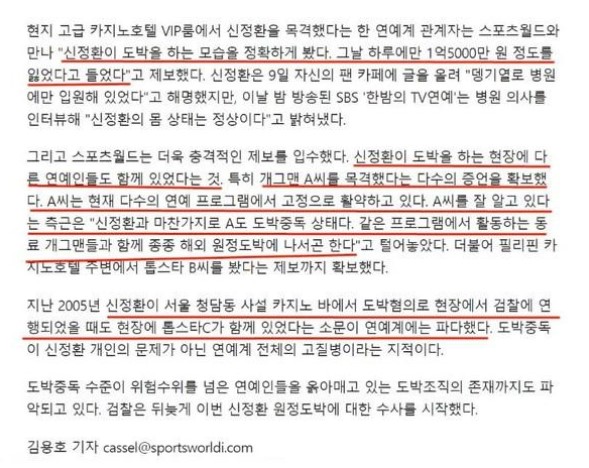 演艺记者出身的视频博主金永浩通过自己的视频平台的频道发布了关于权相佑的信息,称“ 2005 年,申正焕在首尔江南已加私营赌场被警方逮捕,当时和他在一起(赌博)的就是权相佑,申正焕因为没有任何背景而被拘留,但权相佑因为有黑道的关系而逃脱。”